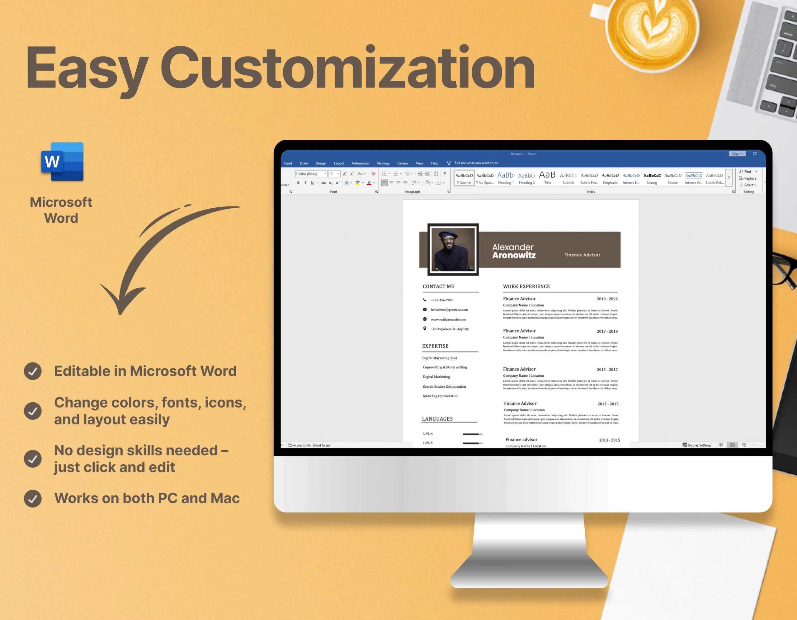 Designed in Microsoft Word (.docx) format, the template is fully editable, allowing you to easily personalise and tailor it to specific finance roles.