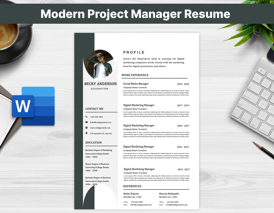 Designed with a sleek, professional layout and fully editable in Microsoft Word, this template lets you showcase your expertise in project planning, stakeholder communication, budgeting, risk management, and performance tracking.